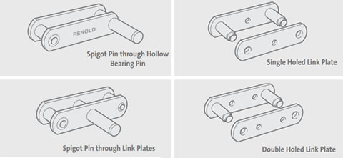 Die einseitige Lochung dient in erster Linie dem Einsatz mit Zapfenbolzen und ist auf beiden Seiten der Kette erforderlich. Die doppelseitige Lochung wird für die Montage von Spezialaufsätzen auf einer Seite oder auf beiden Seiten der Kette bereitgestellt. Die Löcher in den Innenlaschen sind auf der Innenseite ausgefräst, um zu verhindern, dass die Schraubenköpfe die Kettenradzähne verschmutzen.